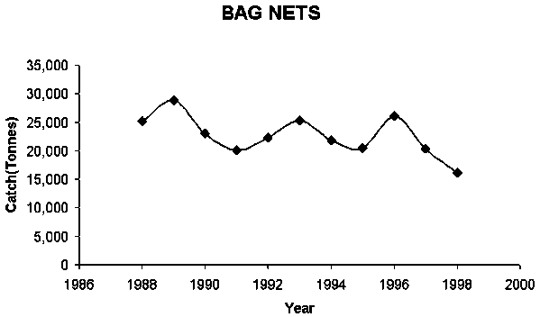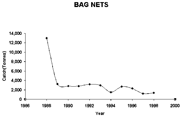 Quite a number of small fishing boats are active in coastal waters. Corresponding to the increased number of fishing boats and the volume of catch, the coastal resources are declining. In 1985, the average catch per horsepower was 1.11 ton/HP but in 2000 it was only 0.45 ton/HP, or 41 percent of the 1985 figure. With a lower percentage of commercial fish, a higher percentage of trash fish in the catch and the smaller size of fish caught, the income per fishing trip is decreasing.