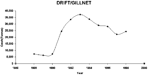 The state of Gujarat, currently the biggest producer of marine fish in the country, faces economic and biological overfishing pressures. The marine fish production of Gujarat has dropped by over 27 per cent to 552 000 tonnes in 1998-99, from a peak of 702 000 tonnes in 1997-98. Since the formation of the state in 1960 until 1998-99, when its total marine fish production increased sevenfold, the size of its mechanized fleet (both IBM- and OBM-powered vessels) expanded 50-fold, and the value of fish production increased by over 500 times. There were about 17 000 mechanized fishing vessels on the register in 1998-99, of which over 14 000 vessels were IBM-powered vessels.