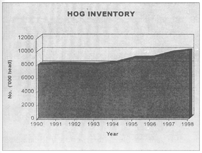 Pig. After 1997, pig inventory shrank abruptly from 8 040 000 to 3 770 000 head. Growth of production slowed down from 6.87 percent in 1996 to 3.59 percent in 1998.
