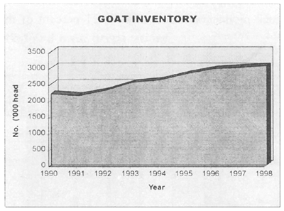 Goat farming in the country is thriving, as shown by the gains in the yearly inventory. From 2.2 million head in 1990, the goat population grew to about 3.1 million head in 1998.