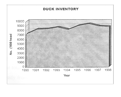 Duck. The duck population decreased from 9 470 000 head in 1996 to 8 824 000 in 1998. This marked