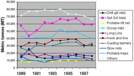 The high catches from guiding barriers are also evident from Table 2.1 but the reported catch per gear is still only about 4 or 8 times that from gillnets and hook and line respectively. The mission would expect catches per gear to be relatively much higher for guiding barriers. Hoggarth et al (1999) report that such barriers account for 49 percent of the catch from an Indonesian river. Also, the mission considers that the mean catches reported per gear are high for many of the other gears. If the reports represent actual catches, this is quite possibly because there is a reporting bias towards commercial/professional fishers.