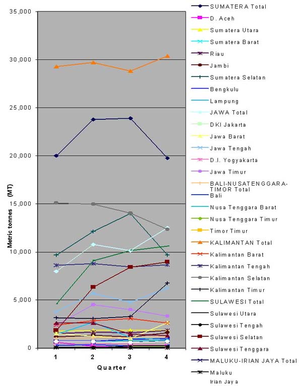 However, the most revealing feature of the reports in Figs. 2-07 to 2-10 is the lack of any apparent trend. First, there should be a trend in all these reports showing an increase in households involved in fishing, total numbers of vessels and gears in operation and total numbers of fishers due to population growth over the 10 year period (about 15 percent, BPS 2000). Second, there should be a clear increase in all these reports as a result of the Asian Economic Crisis (early 1997) which was accompanied by a significant return to fishing as a low capital activity, accompanied with emigration from urban areas. Several reliable commentators in Indonesia confirmed that in inland areas participation in fishing increased by an estimated 30-40 percent as a result of the economic down-turn. But this is nowhere to be seen in the reports. However, both the long-term trend in participation in marine fisheries due to population growth, and the more rapid increase expected in 1997/8 are clearly evident for reports for marine capture fisheries (Fig. 2-11). Not only does this analysis reinforce the view that the reports for inland capture fisheries are unreliable, the latter observation suggests that the reports are much more meaningful for marine fisheries.