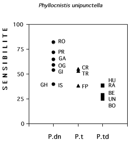 Europe on rencontre principalement Phyllocnistis unipunctella et Ph.
