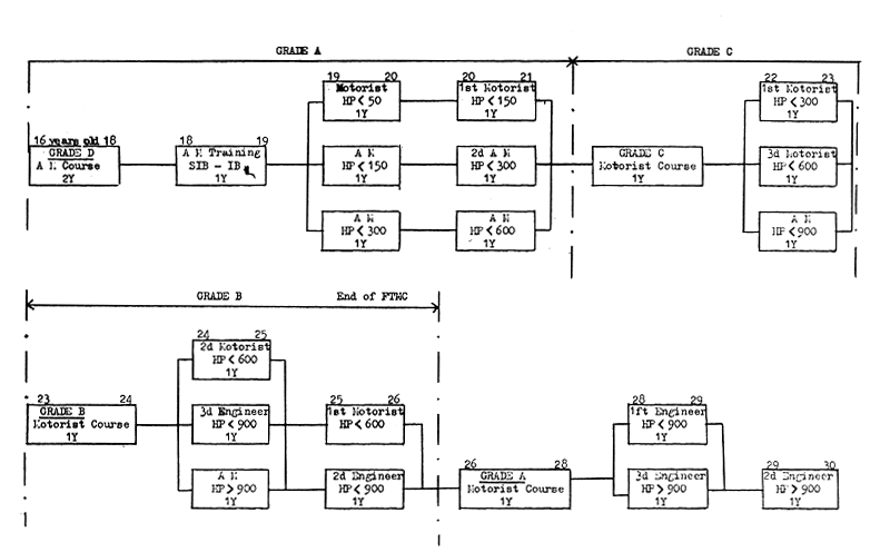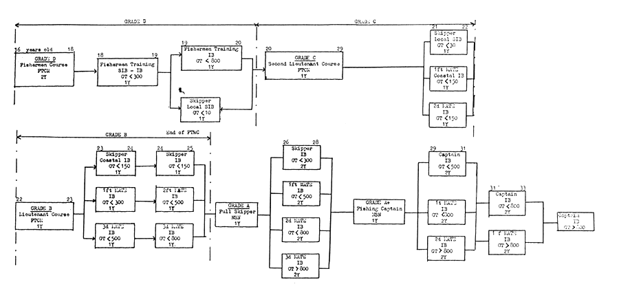 The practical experience of grade ‘B’ lieutenants and motorists improved on board the commercial fleet during one year, applying a strict control of their activities during this third phase of their commercial fishing life, in order to make available for attendance to grade ‘A’ at schools with superior levels, for exemple at the Nautical School (1) about 10 lieutenants and about 5 motorists.