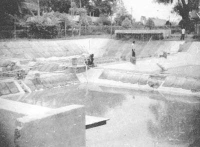 ![]() | Etang cimenté à eau régénérée, Barrackpore, Indes. L'eau d'alimentation est pompée vers le bac de décantation, à droite, en amont, avant d'être réutilisée. (Cliché de l'auteur) |