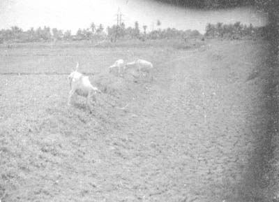 | Rizières expérimentales où se pratique la pisciculture à Rahara, Indes. A droite, canal périphérique ceinturant une série de rizières. (Cliché de l'auteur). | ![]() |