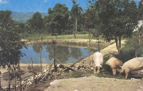 L'élevage associé porcs/poissons à Saut d'Eau.
