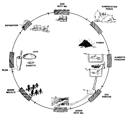 En 1984, lors d'un voyage à la Jamaïque, j'avais rendu visite à un éleveur de porcs qui avait des bassins de poissons faisant suite à sa porcherie. A ma question lui demandant la raison et l'économie de ces bassins, il me répondit que ses poissons étant alimentés avec le fumier de porcs, ne lui coûtaient absolument rien mais couvraient 50% du coût de l'entretien des porcs.”