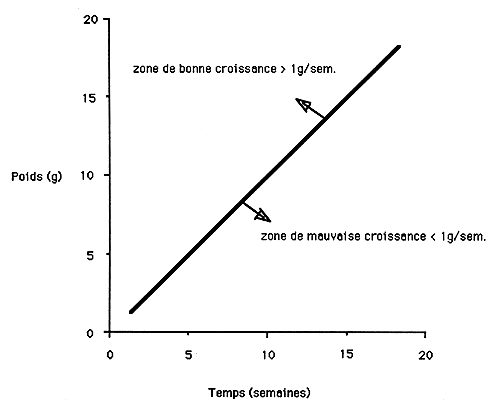 Avec le système semi intensif utilisé dans les fermes commerciales en Amérique, P. vannmeï accuse un gain moyen de 1 g / semaine jugé satisfaisant. L'annexe A présente l'évolution hebdommadaire du poids moyen de P. vannmeï dans un système commercial. Une évolution du poids moyen en dessous de la moyenne de 1 g/ semaine indique des problèmes au niveau de la rentabilité de l'élevage et conduit à l'arrêt du cycle même avant la durée projetée.