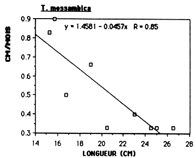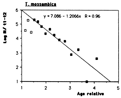 Même avec cette correction, il est probable que les résultats deviennent progressive ment inutilisables lorsqu'on approchera de la taille asymptotique des poissons. Cela ren impératif de tracer un diagramme de dispersion des valeurs Loge N/Δt, afin d'identifier correctement la partie de la courbe de structures d'âges des prises qui peut être utilisé pour estimer Z.