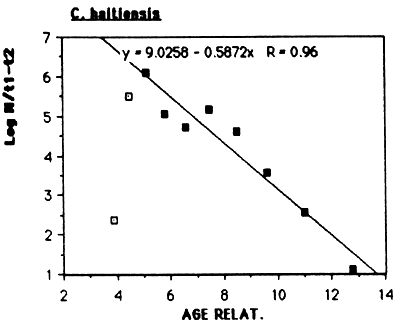 Une autre méthode pour estimer Z consiste à échantillonner une population comportant plusieurs classes d'âges, puis à tracer le logarithme népérien (loge) du nombre de poissons dans l'échantillon (N) en fonction de leur âge t respectif d'où on a: