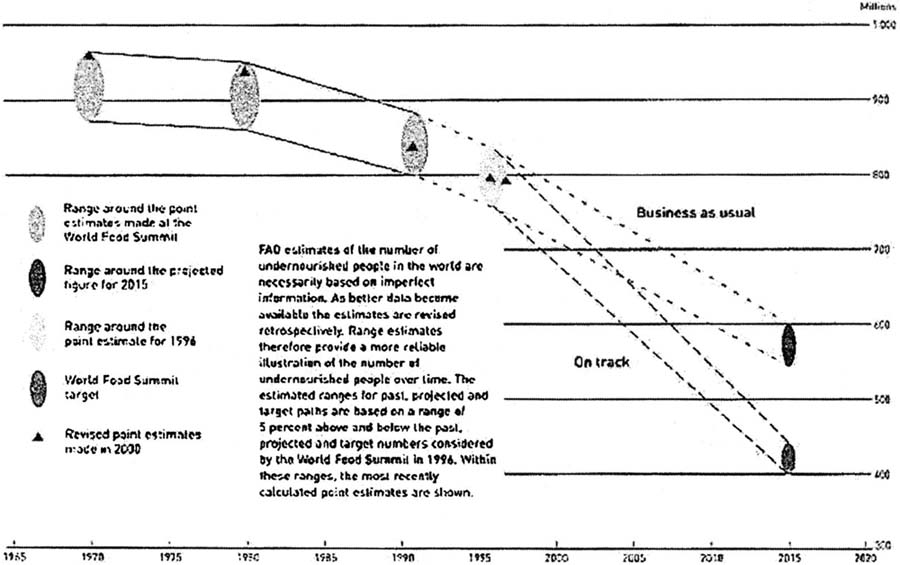 Since the purpose of the exercise is to develop scenarios for country specific investment in land and water development, and production intensification, additional food needs have to be quantified before possible investments to meet these increased needs can be established under various assumptions. The purpose of the exercise is thus to estimate investment required to generate incremental production needed to meet the WFS goal by 2015 as illustrated in the 'on track' projection in the following diagram.