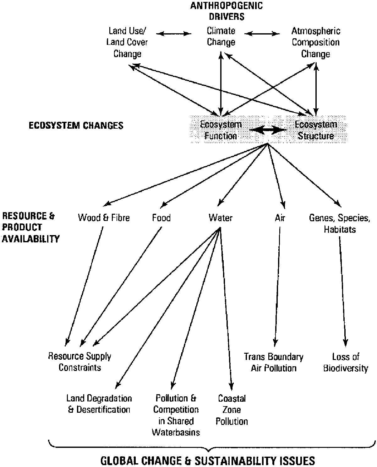 The requirement for GTOS to be global, integrative and long-term has led to the conceptual structure illustrated in Figure 1. It is centred on the five broad questions presented in Box 3 which are fundamental to sustainable human development. Each of them clearly has component questions which must be addressed, for example, on the rates of soil erosion and the degree of reversibility. Moreover, the major development issues and key questions are also part of the conceptual framework, since most of them are inter-related are in some way, and are a largely a function of socio-economic driving forces.