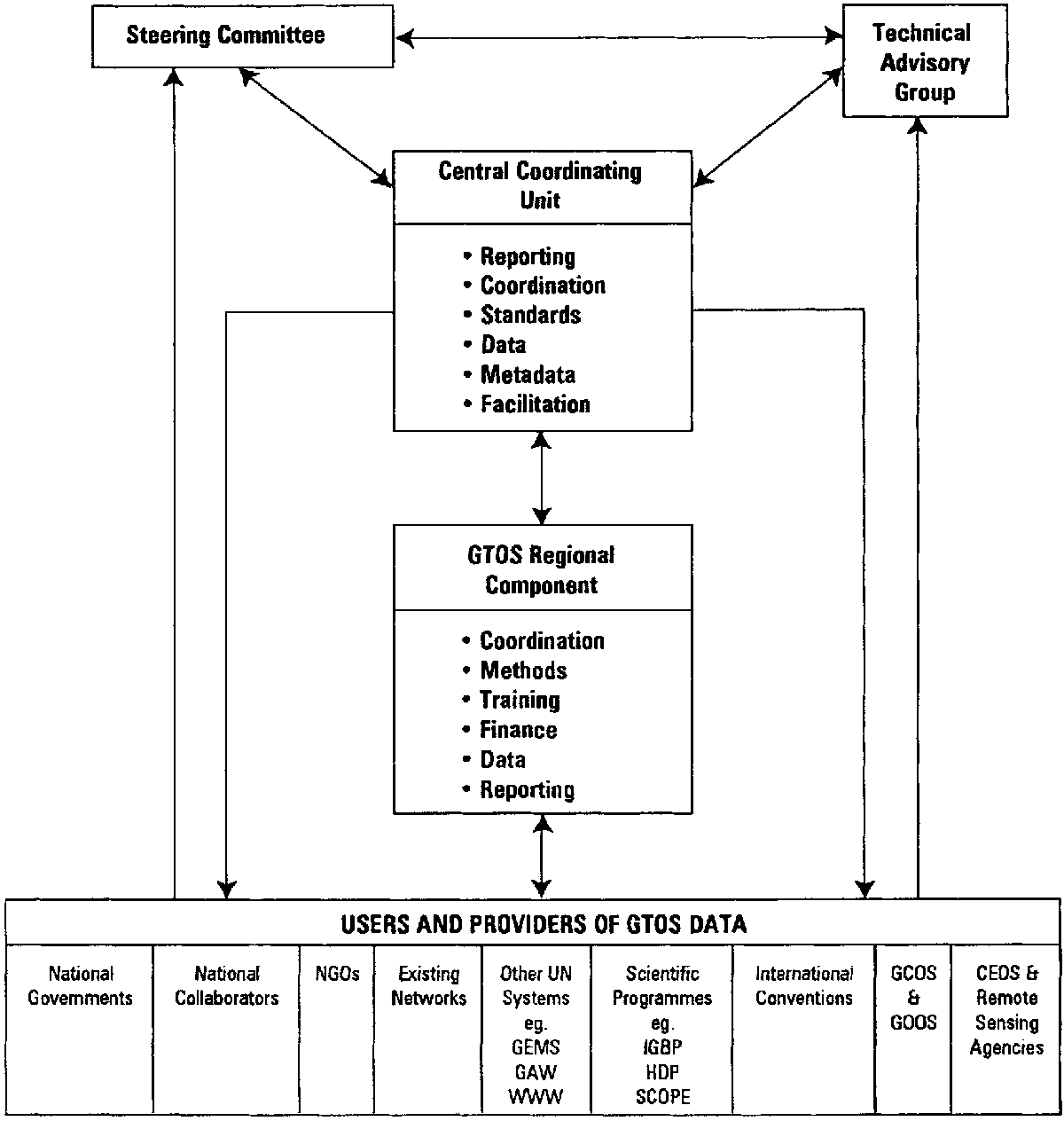 The proposed institutional framework is presented in Figure 2. The proposal seeks to achieve a flexible bottom-up structure founded on the needs and capabilities of a wide range of users and which is consistent with GTOS's extensive mandate. Complete global or regional coverage is not envisaged as part of the initial plan. Regional components should evolve in response to user initiatives at the regional or national level rather than being part of a pre-set structure.
