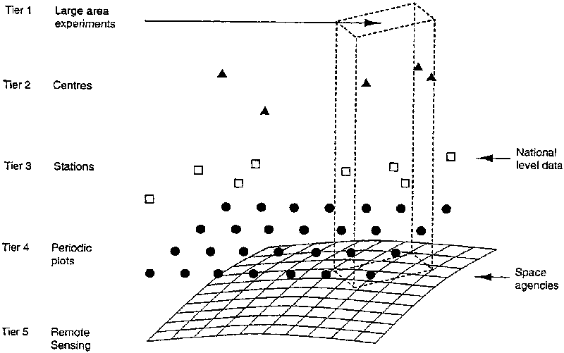 The observational system should be structured hierarchically in the manner illustrated in Figure 3, outlined in Table 2, and detailed in Part II. This structure embraces and extends the hierarchical framework suggested by the GCOS/GTOS Terrestrial Observation Panel, so as to include other non-climate-change-related observations.