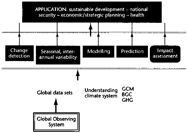 Figure 1.1 shows the relationship between the observing system and the various objectives. The global data sets produced by GCOS/GTOS are a pre-requisite for improving our understanding of the global climate system and its components (atmosphere, biosphere, hydrosphere, cryosphere, and lithosphere). Improved computer models of the climate system, capturing our best knowledge of the mechanisms of climate processes and climate-related interactions between the various components, can be produced using the data sets. Of special importance are general circulation models (GCMs), biogeochemical global climate (BGC) models, and trace gas models. Both data sets and the understanding/models are employed in tracking the variability, changes and impacts of the climate system, as defined by GCOS/GTOS objectives. The resulting findings will be essential for a variety of purposes, mostly at the national level, related to economic and social development, national security, health, international cooperation, environmental protection, and others. Note that the observing systems need to be responsive to feedbacks from the end uses and also to new insights into the climate system and the mechanisms governing its behaviour.