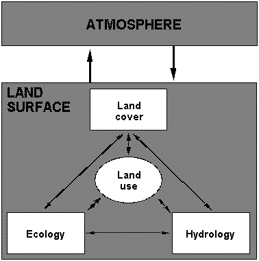 Fig. 3: Components of an integrated model for assessing the effects of environmental changes in mountain regions. The terms "Land cover" and "Land use" are used here to refer to the direct anthropogenic influences on land surface properties (e.g., conversion of forest to pasture).