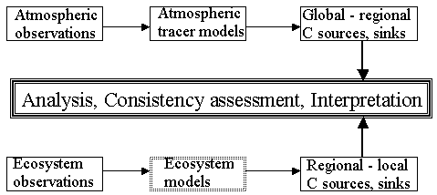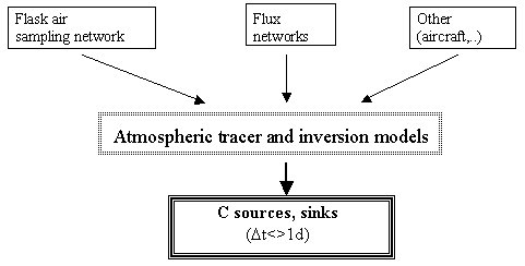 Estimation of regional to global sources and sinks by mesoscale inverse modelling using atmospheric data to establish integral mass-balance constraints on the operational model/satellite products.