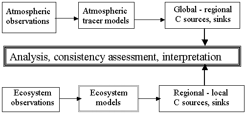 Given the diversity of CO2-ecosystem interactions in the global biosphere and the measurement uncertainties in any single observation strategy, a two-prong observation strategy is necessary which consists of ‘top-down’ and ‘bottom-up’ elements. Since atmospheric CO2 concentrations can be determined accurately and the global distribution computed from relatively few measurements, the regional distribution of terrestrial sources and sinks can be effectively constrained ‘top down’, using these measurements and associated atmospheric circulation models. However, this approach alone does not provide sufficient information on the spatial distribution of CO2 balance at the regional or landscape levels. In addition, the top-down approach does not elucidate the underlying mechanisms responsible for carbon balance distribution. Thus, it cannot be used to predict future carbon balance distribution and thereby assist in forming C-related policies and management options. Consequently, a complementary ‘bottom-up’ approach is necessary in which the carbon balance is assessed individually for small parcels of the terrestrial ecosystems, the size of which is determined primarily by the resolving capabilities of the satellite sensors. The results of these assessments are then combined to ensure both global/regional consistency and geographic specificity.