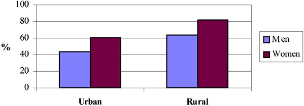 Figure 5 shows the proportion of working adults engaged in self-employment in their primary job, by sex and residence. A far greater proportion of women relies on self-employment than men, in both rural and urban residence.