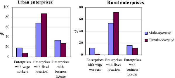 Non-farm enterprises operated by women differ distinctly from those operated by men. In both rural and urban areas, women are much more likely to be engaged in retail sales, to operate hotels and restaurants and to produce textiles and garments. Men mainly run enterprises producing or processing goods (other than textiles). Figure 6 shows the characteristics of male and female owned non-farm enterprises by location, based on 1997-98 data. Enterprises operated by women typically employ fewer individuals. They are also less likely to have a business license than those operated by men, in both rural and urban locations. As women's businesses are predominantly involved in sales, they tend to have a fixed location.