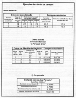 En el caso de los datos de demanda, abastecimiento y oferta indirecta, obtenidos por cuestionario, el cálculo de campos se hará para cada unidad muestra¡ (familia, establecimiento de usuario, productor). Para la oferta directa (inventarios forestales) los cálculos se harán primero para cada uno los elementos de las unidades muestrales (árboles dentro de las parcelas) y posteriormente para cada parcela.