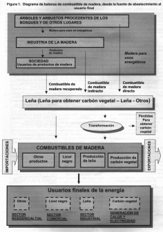 La figura 1 presenta una visión conceptual de los sistemas dendroenergéticos, indicando cómo fluye físicamente la dendroenergía para satisfacer la demanda. La figura introduce los tres tipos de fuentes de suministro: la naturaleza (bosques y árboles fuera del bosque), las industrias madereras y la sociedad. También se hace referencia al usuario, indicándose los principales sectores de la demanda. El cuadro se completa con consideraciones adicionales referentes al comercio de dendroenergía.