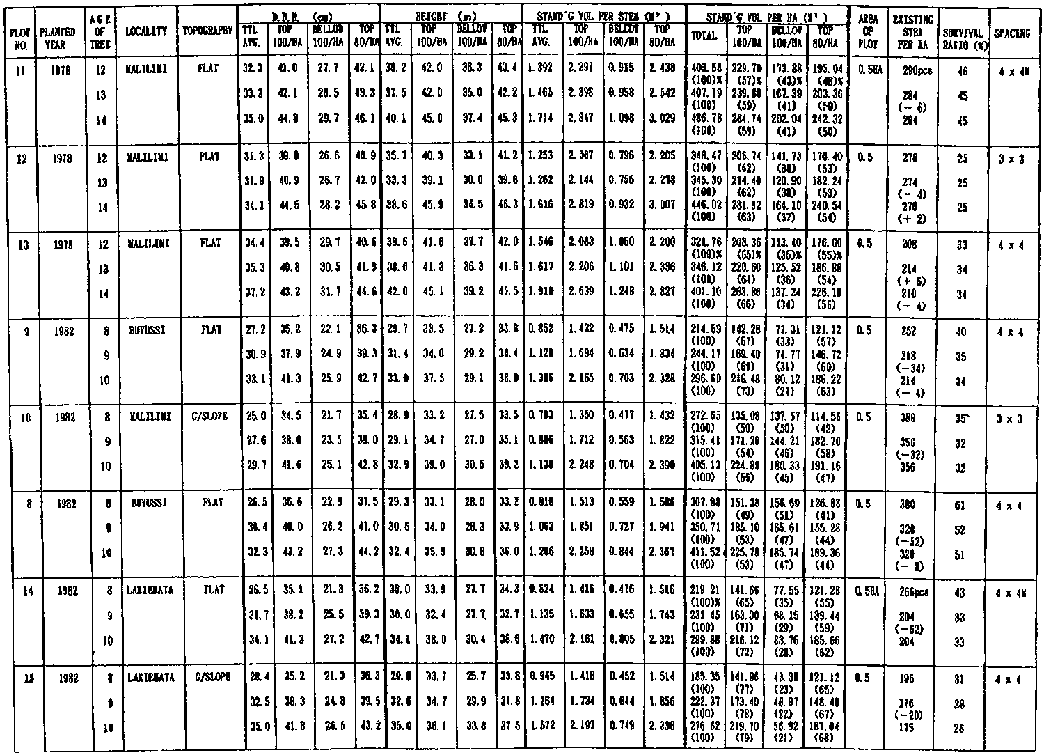 The reforestation work as the first experimental phase began in 1975 and continued until 1978 with establishing 255 ha of kamerere. Subsequently in 1981, the other three species were added. Sample plots to observe growth and other factors were established in 1982. The detail field record of kamerere is attached in Annex I, because this is only one Eucalyptus species among others. However, their growth records are summarized in Figure 2, and estimated sizes and yields by the end of each cutting cycle are shown in Figure 3.