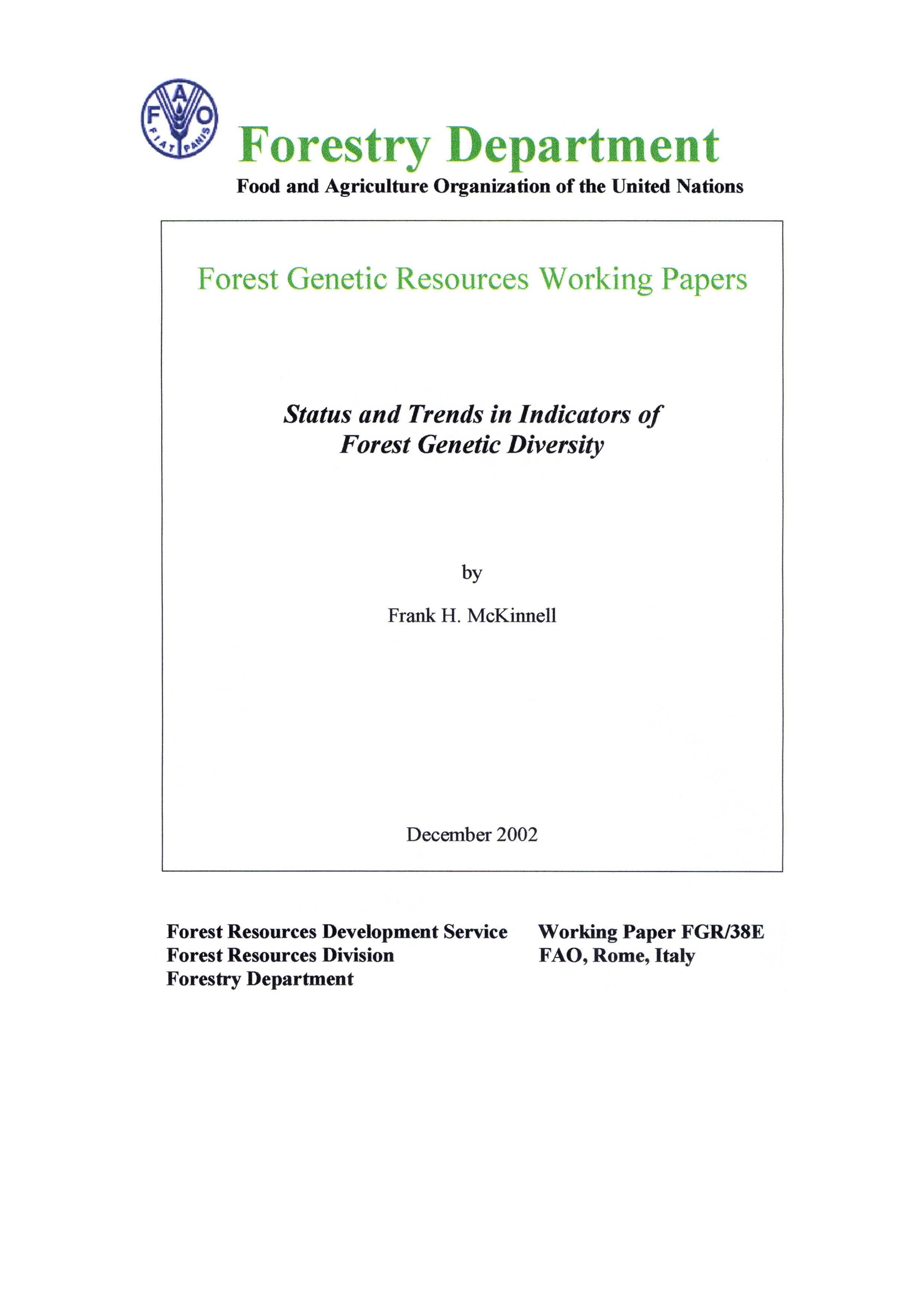 FAO (2002) Status and Trends in Indicators of Forest Genetic Diversity. Document prepared by Frank H. McKinnell. Forest Genetic Resources Working Papers, Working Paper FGR/38E, Forest Resources Development Service, Forest Resources Division. FAO, Rome (unpublished).