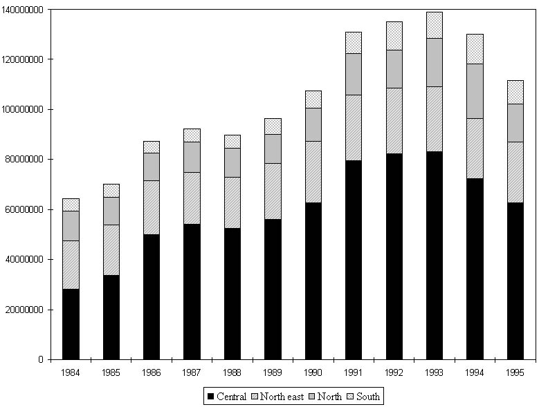 Between 1984 and 1995, chicken numbers increased by about 73 percent overall, with the largest increase in percentage terms occurring in the Central. Here chicken numbers more than doubled between 1984 and 1995 (Figure 4.1).