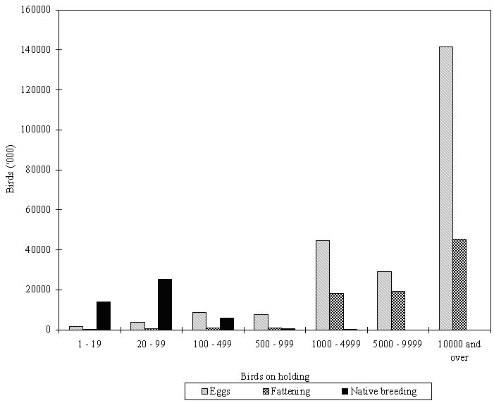 Chicken farms are of three broad types (Kehren and Tisdell 1996). First, there are backyard farms where chickens are raised on a small scale for consumption by the farm family or as a source of supplementary income. In the mid-1980s, all but one percent of growers were backyard growers, and they produced about one third of production. By the mid-1990s, they accounted for less than 25 percent of production due to the expansion of commercial farms. Backyard growers provide little if any care to poultry; and consequently losses are high (Noppakun 1998). The second group of farmers are independent commercial growers who often engage in contract growing with smaller growers. The view of Kehren and Tisdell (1996) is that their numbers are likely to decline in the future because of their inability to benefit from economies of scale attained by the large commercial growers. The third group of growers are contract growers. They became important in the late 1970s when the Charoen Pokphand Company[7] introduced wage and price guaranteed contracts between chicken growers and hatcheries and feed companies. Large multinational companies now dominate the industry. Kehren and Tisdell (1996) report for example that 10 to 12 companies control about 80 percent of broiler production. Figure 4.2 shows the small farms tend to be involved mainly with the breeding of native birds while the large farms with over 10 000 birds tend to be involved in egg productions. Obviously most poultry are found on large farms. For example, about 140 million birds used for producing eggs were on farms with 10 000 birds or more. Most of the broilers used to produce chicken meat are on the large farms.
