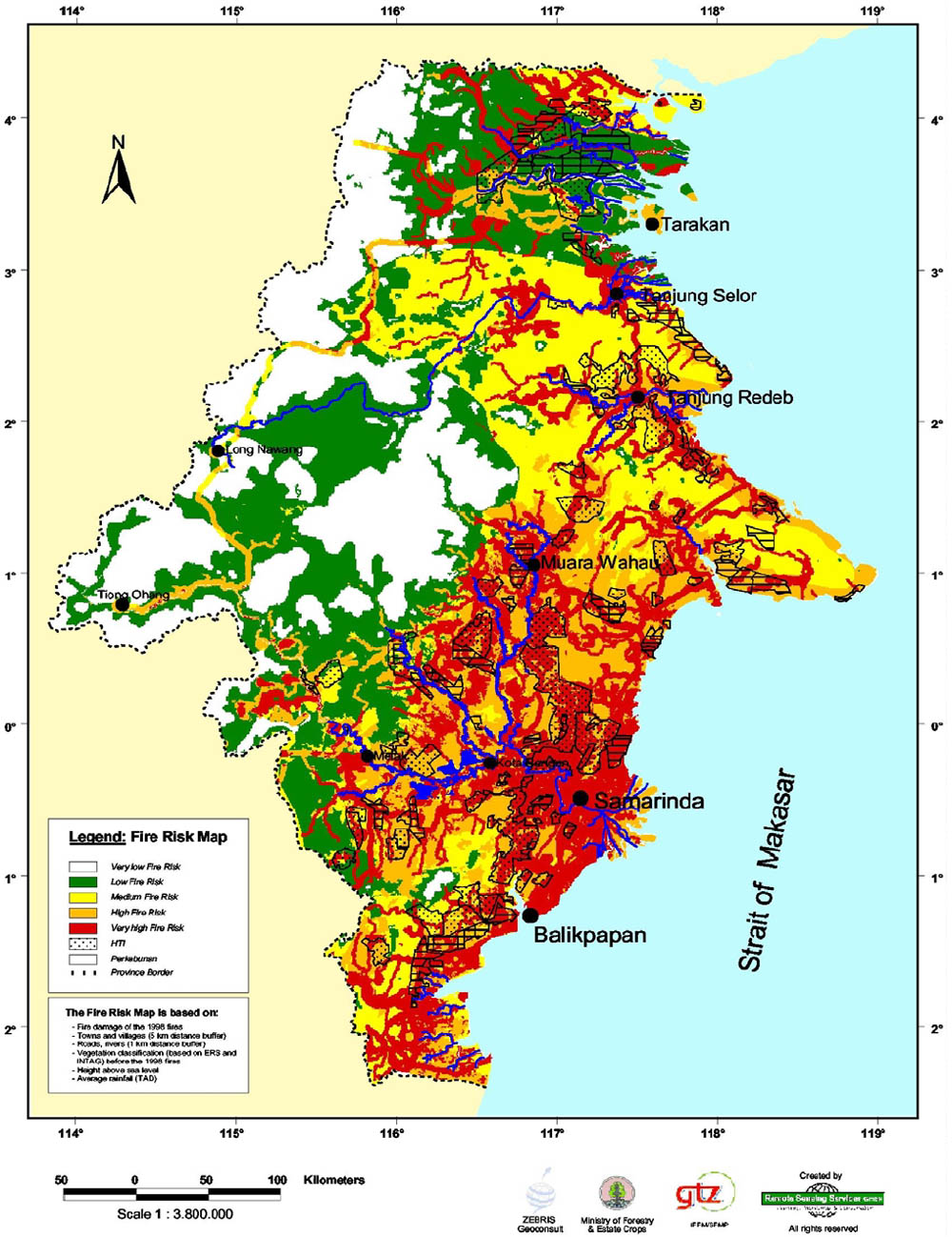 Hoffmann, A.A., Hinrichs, A. & Siegert, F. (1999). Fire damage in East Kalimantan in 1997/8 related to land use and vegetation classes: satellite radar inventory results and proposals for further actions. IFFM/SFMP/GTZ, Integrated Forest Fire Management project, Samarinda, East Kalimantan, Indonesia.