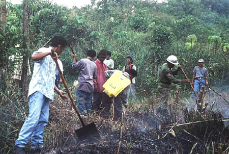 Equipment traditionally used to fight fires consists of simple hand tools like machetes, wooden rakes and small bamboo hand-pumps. When nothing else is available, banana leaves or a bundle of wooden sticks are used to fight fires. Generally, such equipment is effective in fighting grass fires or safeguarding small slash-and-burn fires, but it is unsuitable for hot wildfires like those in 1997/98.