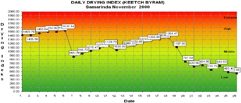 The Keetch Byram Drought Index (KBDI), introduced and applied by IFFM and calculated by the governmental meteorological service - Badan Meteorologi dan Geofisika (BMG) - for the province, is the basic tool for an early warning system for fire.[14] The index is input into a fire danger-rating matrix that describes four fire danger classes as low, moderate, high and extreme.