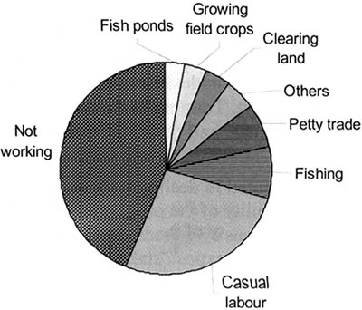 The widespread destruction of the ecosystems in East Kalimantan has forced farmers to look for alternative livelihoods. Since 1997, more than 35 percent of the farming community are involved in illegal logging, petty trade, and occasional work, while others rely on coconut farming. Figure 1 shows the alternative income generating activities in Marang Kayu sub-district, one of the seriously affected areas. Logging is not included in this case mainly because there is no forest left in the area.