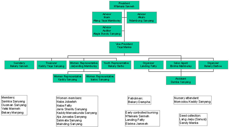 Just one month after the introduction of the concept, a Forest Committee of 20 village representatives was formed to co-ordinate the establishment and management of the community forest. The committee included youth and women representatives, with the alkalo and Imam as advisors. The structure of the committee has remained virtually unchanged to this day (Figure 4). The community selected a site of almost 500 ha adjacent to the farmland southeast of the village, extending up to the boundary of KWNP (see Figure 2). The community forest, named Nganing-Koi after a local tree species (Acacia seyal), was demarcated in November 1994.