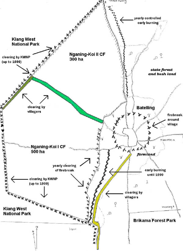 The case of Nganing-Koi demonstrates both the potentials and the limitations of community-based fire management. While the community of Batelling had traditionally employed fire management measures such as early burning to protect their assets, community forestry has laid the basis for sustained and co-ordinated fire prevention measures. It has also incorporated the advice and assistance of forestry extension staff, such as the construction of an extensive firebreak system and early burning.