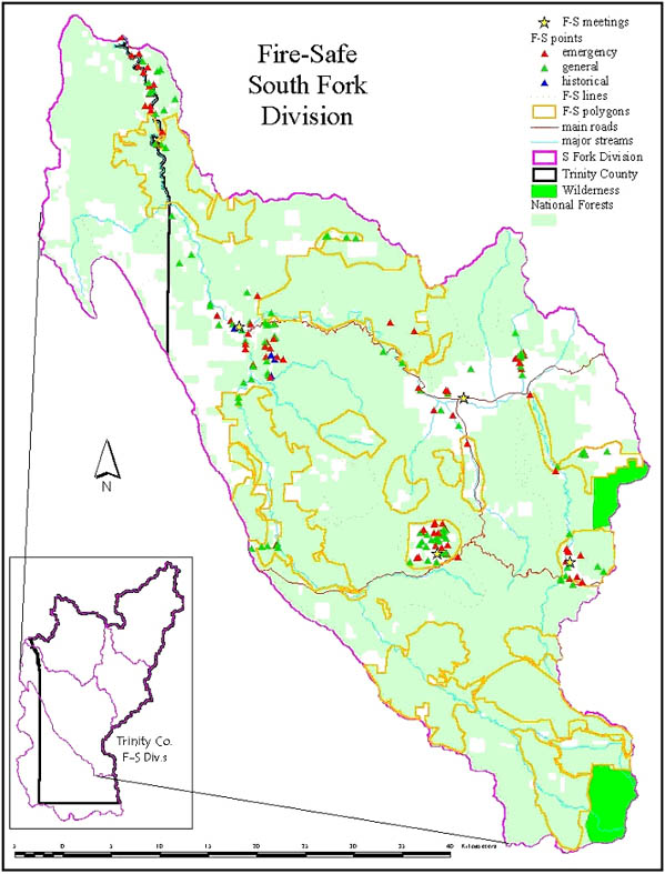 The FSC has embarked on a landscape analysis and strategic planning process for fire management in the county. The first steps taken in 1999 and 2000 were to increase local involvement and interest in fire management planning. The objective was to capture local and regional knowledge and expertise in fire management as effectively and efficiently as possible. Participatory research and community mapping methods were adapted to achieve this goal. Two local NGOs - the Trinity County Resource Conservation District and the Watershed Research and Training Center - provided the team that led the effort, with funding from the USFS Pacific Southwest Research Station and the California State Water Resources Control Board.
