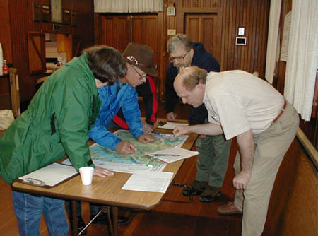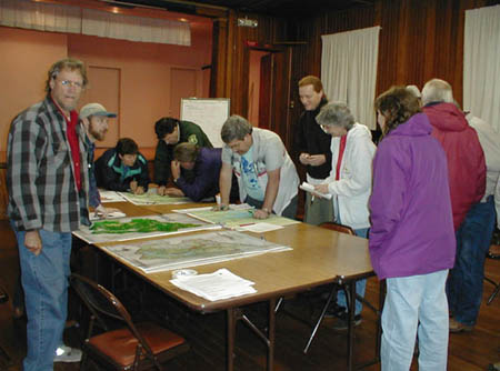 Figure 3: Participants gathered around maps at the North Lake Meeting, May 16, 2000 (photos by Carol Fall)