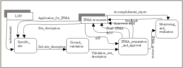 DFDs may be established at different levels of an organization; depending on the requirements of the task, more details can be added to the diagram. For example, a contextual DFD may appear as shown in Figure 1. As mentioned earlier, DFDs may be drawn in more detail depending on the requirements of the analysis. Figure 2 shows that an Integrated Forest Management Agreement (IFMA) system may be sub-divided further into its component sub-systems. These components may refer to the following processes: species-site identification, ground validation, IFMA preparation and proposal, monitoring and evaluation. The input and output files are shown by the corresponding arrows which also indicate the flow of data.