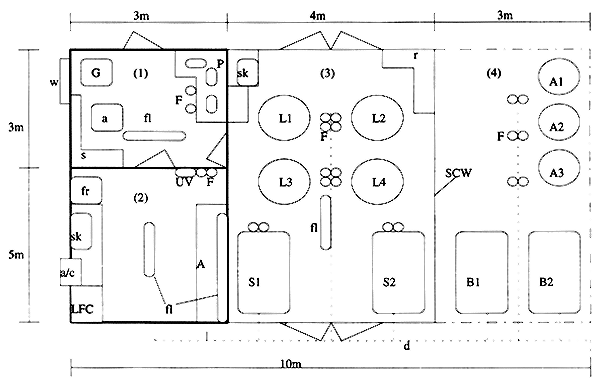 a; autoclave, a/c; airconditioner, d; drain groove, fl; fluorescent lights, fr; fridge, r; drying rack, s; shelves, sk; sink, w; window,