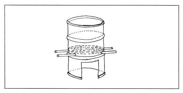 | Materials needed: | one 55 gallon oil drum two iron rods about 50 cm long a hessian bag, pandanus mat or plywood board to cover the top Some lengths of galvanised steel rod (2–3 mm diameter) for tenter rods. |