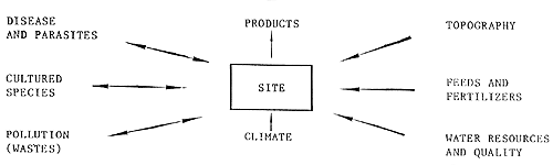 The direction of arrows indicate direction of impact of each component. Those on the left have implications both into and out of the culture system. Diseases and parasites can enter the system by contaminated seed or from the natural water source, but the pond/pen/cage may also act as a potential source of downstream impact on other culture units, natural fish populations and wildlife. The cultured species may have direct or indirect environmental effect on natural populations downstream, by potential release of genetically or ecologically superior species. Pollution of upstream water sources may have severe impact on the culture system, but wastes that are freely dispersed from the culture unit may also cause oxygen depletion of downstream waters and enhance conditions for parasitic development.