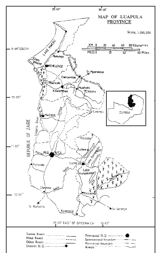 The survey teams for Mansa, Mwense and Samfya districts (25 July – 11 August, 1988) consisted of Mr. K. O. Wahlstrom of ALCOM, and Ms. Nelly Mazingaliwa, social science graduate from the University of Zambia. Assistance was provided by the following personnel from the Department of Fisheries -- Mr. C. Tembo, Fish Culturist, Mansa; Mr. Mubumba, Fish Culturist, Mansa; Mr. Mulenga, Laboratory Assistant, Samfya; and Mr. Robinson, Fish Scout, Samfya.