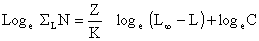 où ∑L N est l'effectif cumulé au-delà d'une certaine taille L et C est un terme complexe indépendant de L. La fonction d'ajustement de loge ∑L N sur (Loo-L) est donc une droite de pente égale à Z/K, Z étant supposé constant (Fig. 50). Si la linéarité n'est pas respectée pour tout l'intervalle des tailles étudiées, seule la partie linéaire sera utilisée pour la régression. L'intervalle utilisable doit cependant représenter une proportion suffisante de l'ensemble pour qu'une certaine signification soit accordée à la valeur de Z ainsi calculée.