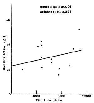 Lorsque l'on ne dispose pas de périodes de stabilité et que l'effort varie continuellement, ces auteurs proposent (p. 234) une méthode dérivée de la précédente et analogue, par son principe, à celle qui est utilisée au paragraphe sur les marquages. Si l'on dispose d'indices d'abondance moyenne pour plusieurs périodes successives pour lesquelles on connait l'effort moyen, la régression de