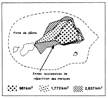 Dans le cas particulier des crevettes, la nécessité de travailler avec un intervalle de temps court (le mois par exemple) implique que les hypothèses de base de ce procédé ne sont pas remplies lorsque l'on utilise des histogrammes de capture mensuels.