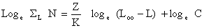 donde ΣL N es la suma del número de individuos de talla superior a L y C es un término complejo independiente de L. La función de ajuste de loge ΣL N sobre (L∞ - L) es pues una recta de pendiente igual a Z/K, suponiendo Z constante (Figura 50). Si la linearidad no es respetada por todo el intervalo de tallas estudiadas, sólo la parte lineal se utilizará para la regresión. El intervalo escogido debe sin embargo representar una proporción suficiente del conjunto para que el valor de Z así calculado tenga cierta significación.