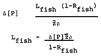 Lfish is largely in particulate form, and the proportion of the waste faecal and food P which contributes to the pool of dissolved P depends on many factors; the P content of the feed, diet composition, pellet shape, temperature, depth of water under the cages, presence/ absence of scavenging fish, etc. (Bienfang, 1980; Collins, 1983; Merican, 1983). Modelling of these wastes is in progress, and preliminary data suggests that Rfish > R. However, until such models are available, Rfish must be assumed to be the same as R in the first instance, and, subsequent to the introduction of cages and the steady state [P] having been reached (see below) it must be recalibrated:-